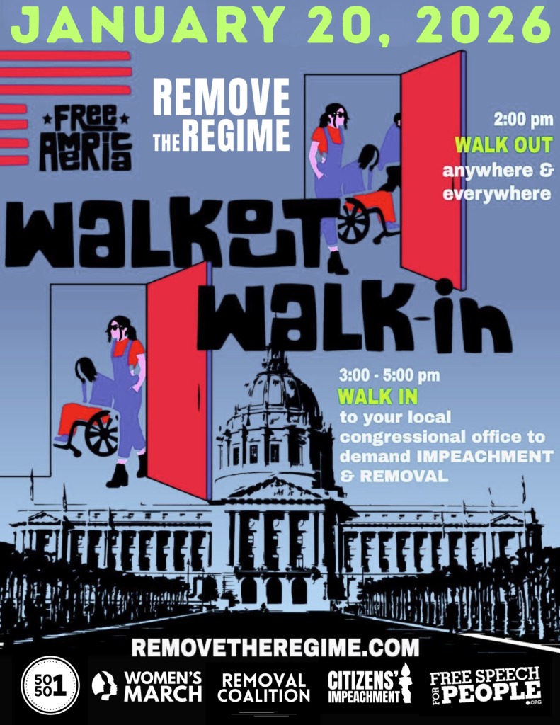 On January 20, 2026, join our partners Citizens’ Impeachment, Free Speech for People, Women’s March and 50501 as we “walk out” of anywhere & everywhere at 2:00 p.m., and “walk in” to our local congressional offices to demand impeachment and removal. Let’s give Congress a nationwide mandate to Free America and Remove the Regime!
